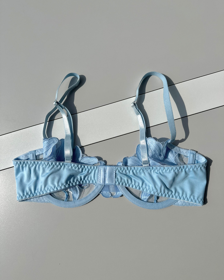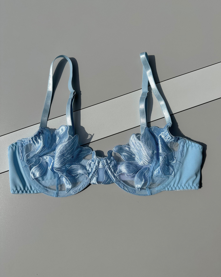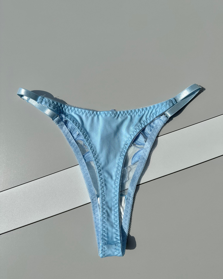 El Set Kaiori combina el equilibrio perfecto entre sensualidad y romanticismo. Su tul transparente bordado con flores azul cielo ilumina la piel, mientras el diseño estructurado del brasier y el bottom de tiras finas crean una silueta encantadora y sofisticada. Ideal para ocasiones especiales o para sentirse única cualquier día.