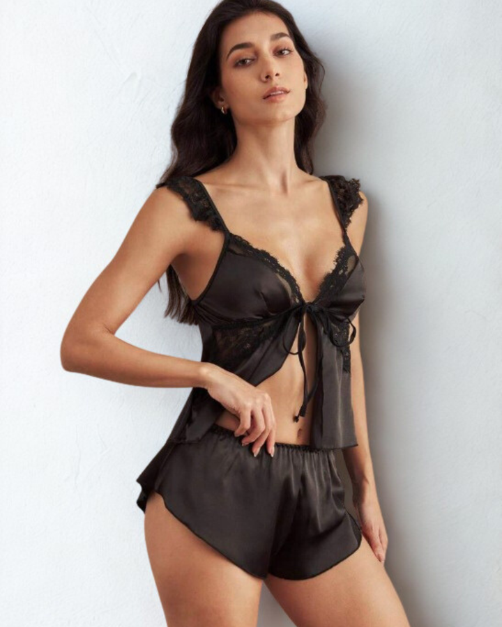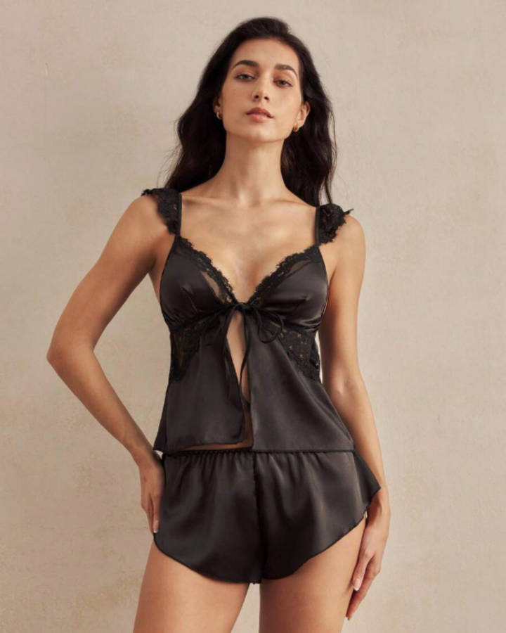 El set WINNIE está confeccionado en satín sedoso que se desliza sobre la piel con una textura ligera y femenina. Su top con tiras anchas en encaje y lazo al frente realza la figura con sutileza, mientras el short fluido de corte curvo acompaña el movimiento con delicadeza. Un conjunto que redefine la sensualidad en clave de comodidad y sofisticación.